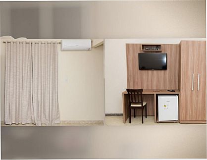 O Hotel oferece quartos confortáveis com ar condicionado, frigobar, TV, internet, wifi e café da manhã.