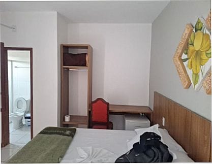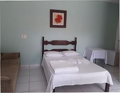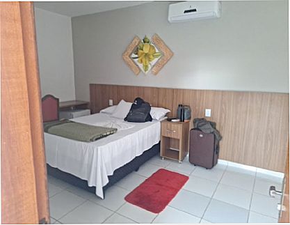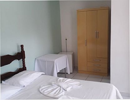 Hotel no centro da cidade, quartos de casal e solteiro, todos com suite e televisão